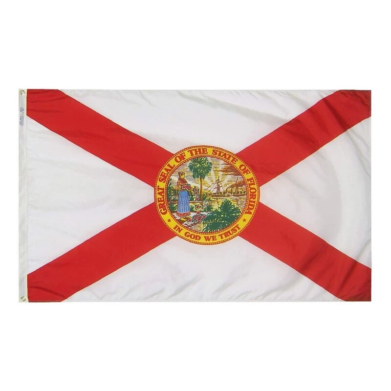 Florida created a new state seal after it seceded from the Union in 1861, and made final modifications to the seal in 1970. Florida Governor Francis P. Fleming, who thought that the predominately white Flag looked too much like the traditional Flag of surrender, added the red cross of St. Andrew to the white Flag with the state seal in the middle. According to Florida law, the most current state seal must always grace the state Flag, and must be one-half the hoist and occupy the center of a white ground. All Annin Flagmakers flags are sewn in either South Boston, VA or Coshocton, OH. Annin’s superior quality is time-tested and meets the requirements of the most discerning buyer.