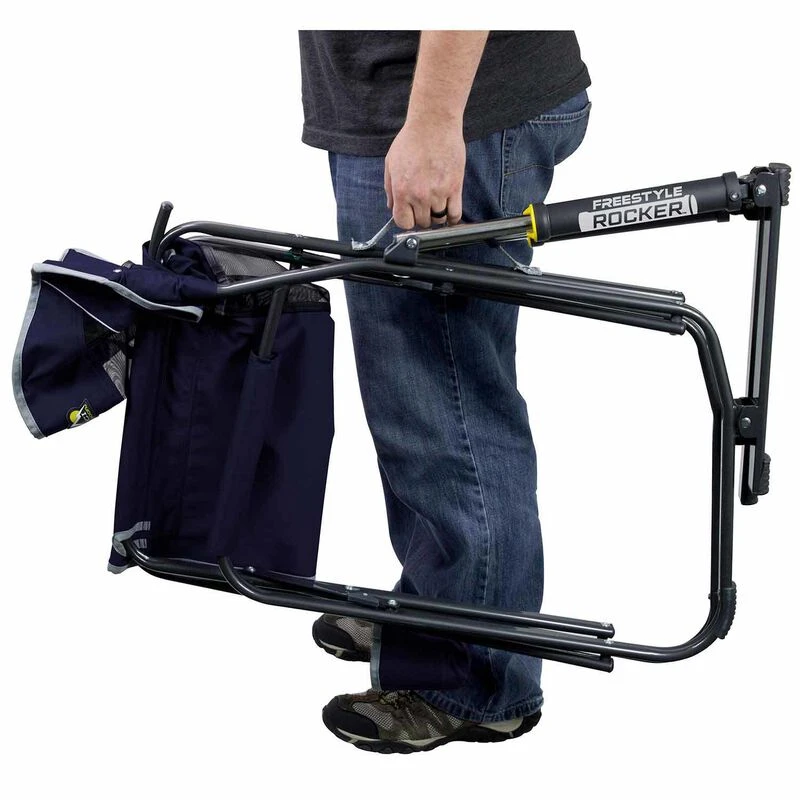 With Spring-Action Rocking Technologyâ„¢, the Freestyle Rocker provides a smooth and relaxing rocking motion on rough or hard terrain. Durable construction features a powder-coated steel frame designed to support up to 250 pounds. Usage is made easy by EAZY-FOLDâ„¢ Technology, which enables easy set-up and for this rocker to fold flat for transport. Conveniences include a beverage holder and carry handle.