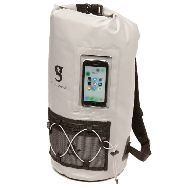This backpack features a 20L capacity, durable pvc tarpaulin material and a sleeve to store and still use your phone. Have easy access to gear with the outside mesh zip pocket and bungee cords.