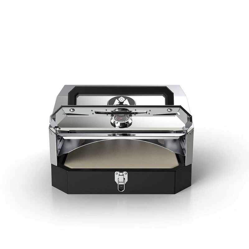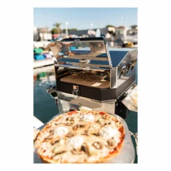 The Pizza Top is made from marine grade, mirror polished stainless steel and cast aluminum base. Includes curved inner liner and cordelite pizza stone for the perfect pizza on board.Â