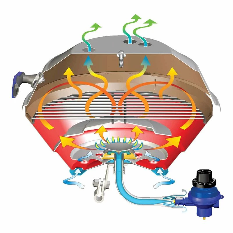 The patented swiveling turbo venturi tube allows you to adjust the control valve inboard, outboard, left or right; wherever it is most convenient to you. This design also allows for quick, safe fuel canister changes even while grilling. The turbo venturi tube in combination with the newly designed burner virtually eliminates blow-outs. The grill quickly disassembles without tools for easy clean-up.