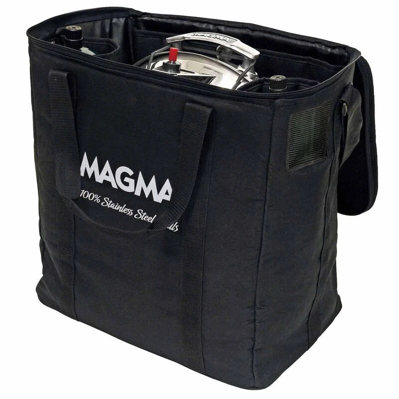 MAGMA Padded Grill Carry Case allows you to conveniently store and transport your grill and accessories. Designed to keep everything in one space-saving location. A large compartment holds the grill with pockets for storing a serving shelf, griddle or fish/veggie tray. Side pocket holds propane canisters. Thick padding for maximum protection and heavy-duty handles and shoulder strap for carrying from harbor to backyard barbecues in comfort.