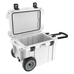 Pelican Elite 45 Quart Wheeled Cooler. Full 45 Quart internal acpacity. Up to 10 days ice retention, freezer grade gasket, 2″ polyurethane insulation. Press & Pull Latches (Wide for Gloved Use). Integrated Fish Scale on Lid. Heavy duty wheels.