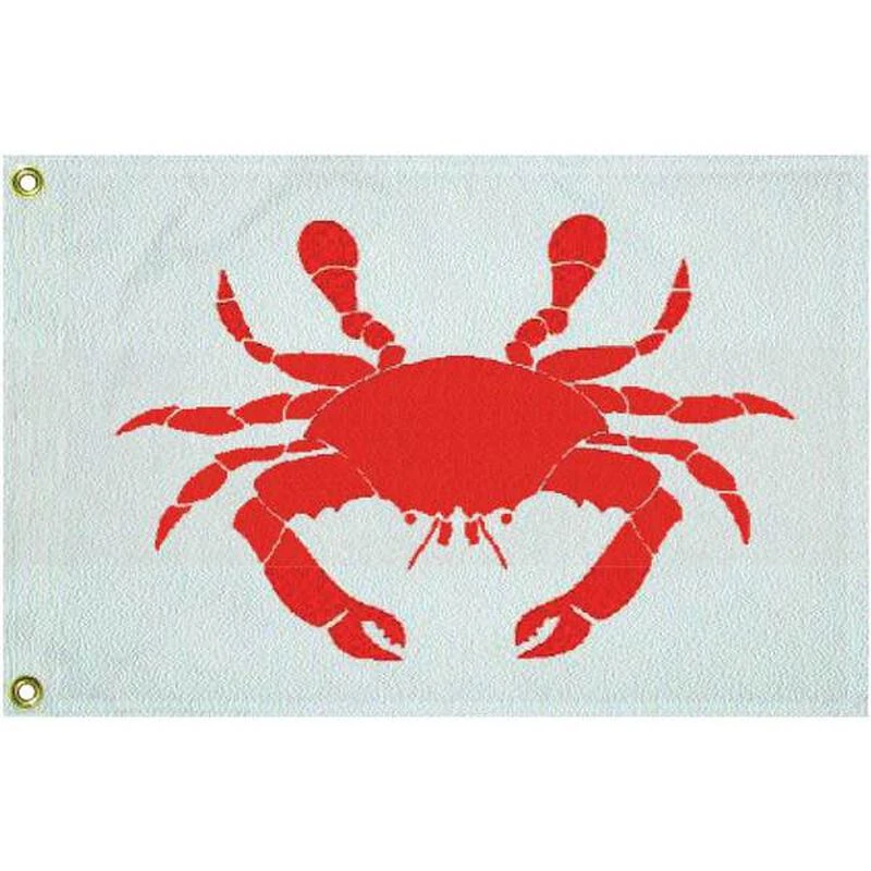 Raise this durable nylon flag to show your crab-loving spirit. It is screen-printed in a bright red-orange color. Brass grommets protect the nylon from rope rubbing. Dimensions are 12″L x 18H”. Made in the USA.
